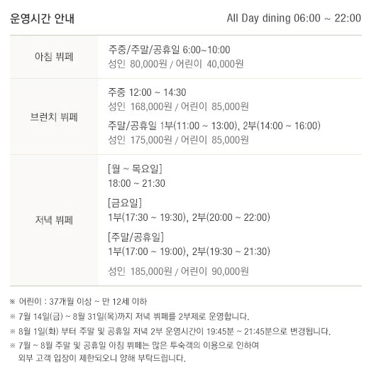 아침 뷔페 : 주중/주말/공휴일 06:00~10:00