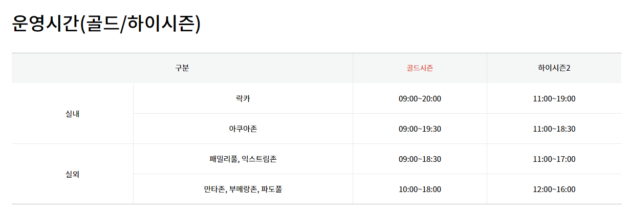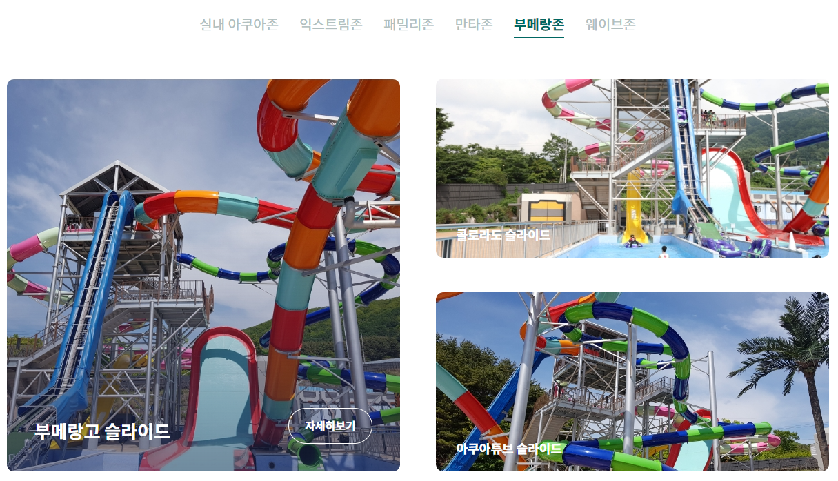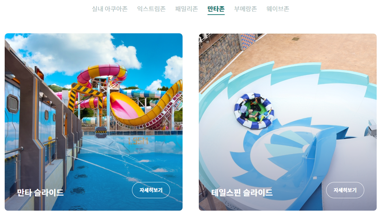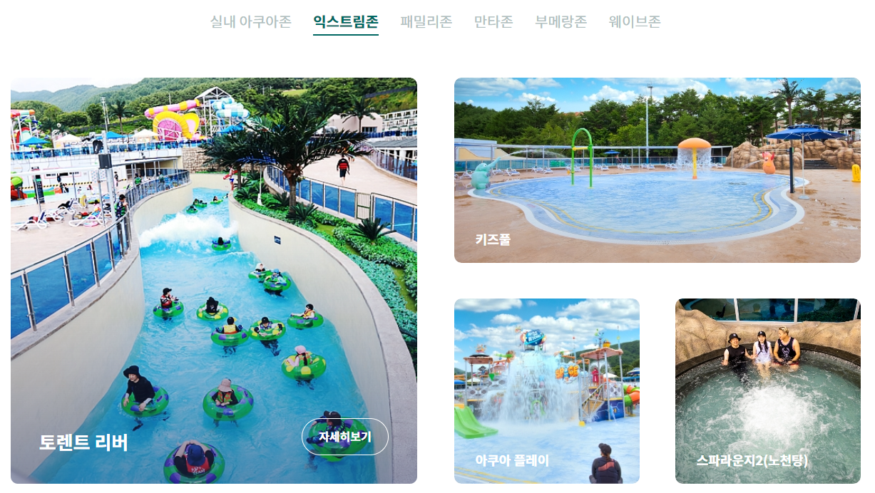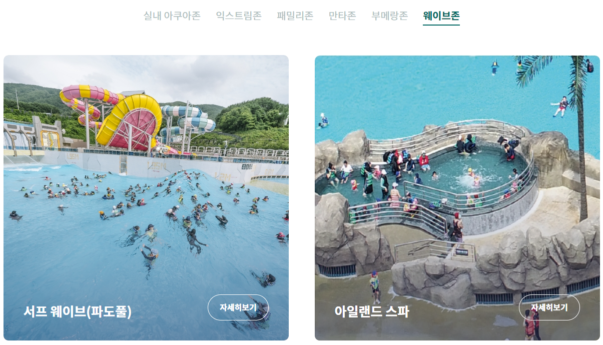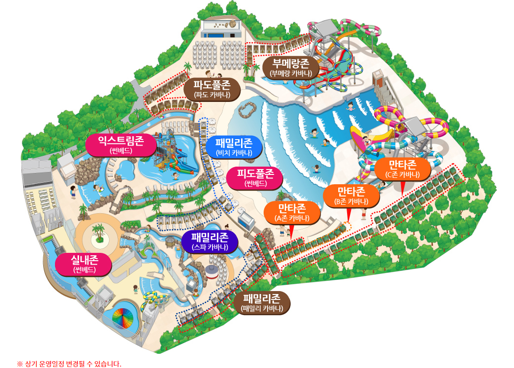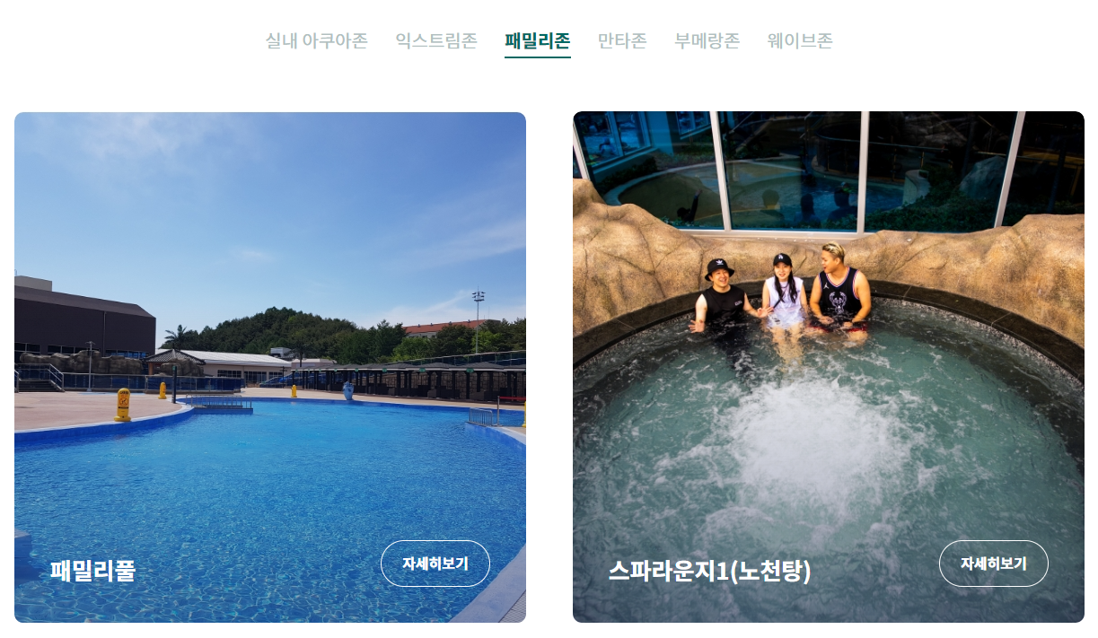 패밀리존 : 파도풀, 만타슬라이드, 테일스핀슬라이드, 부메랑고 슬라이드, 아쿠아튜브 슬라이드, 콜로라도 슬라이브, 용품샵, 노천탕, 패밀리풀