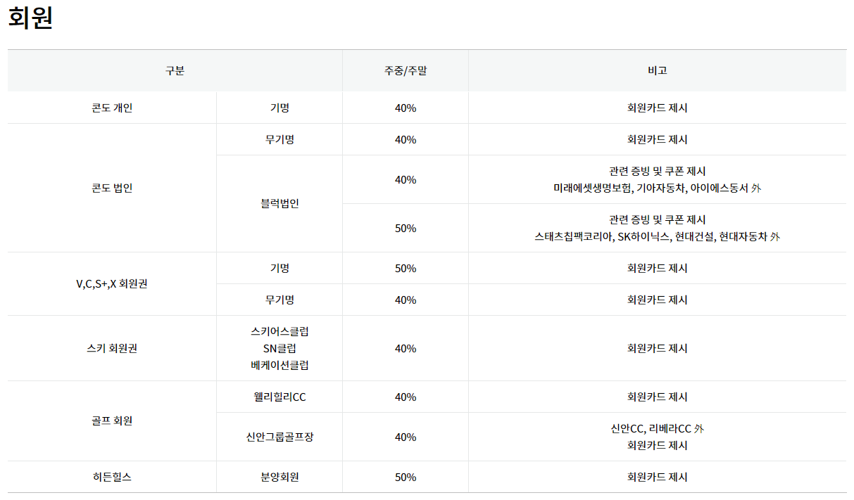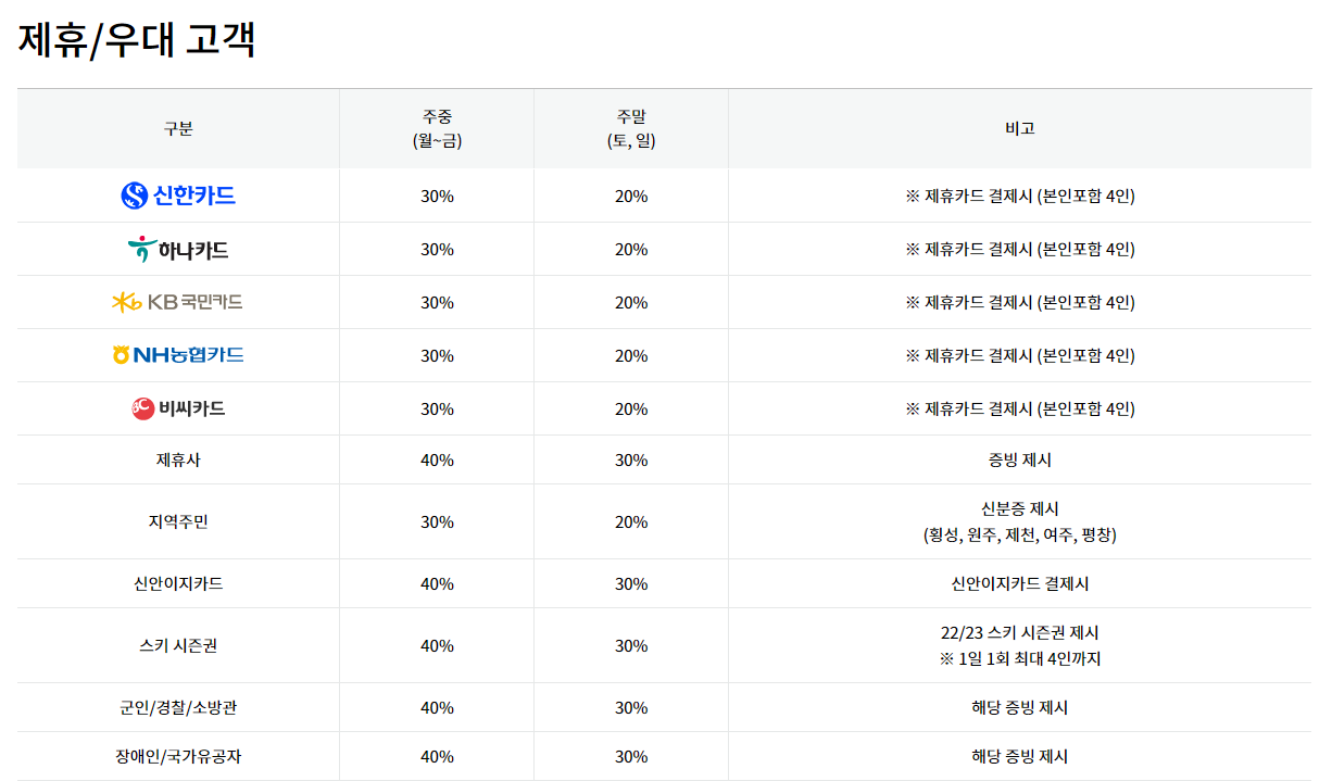 신한카드, 하나카드, KB국민카드, NH농협카드, BC비씨카드, 제휴사, 지역주민, 신안이지카드, 스키 시즌권, 군인/경찰/소방관, 장애인/국가유공자, 객실 투숙객, 외국인, 모바일 할인쿠폰, 스마트 예약