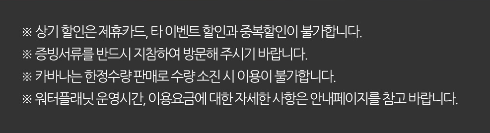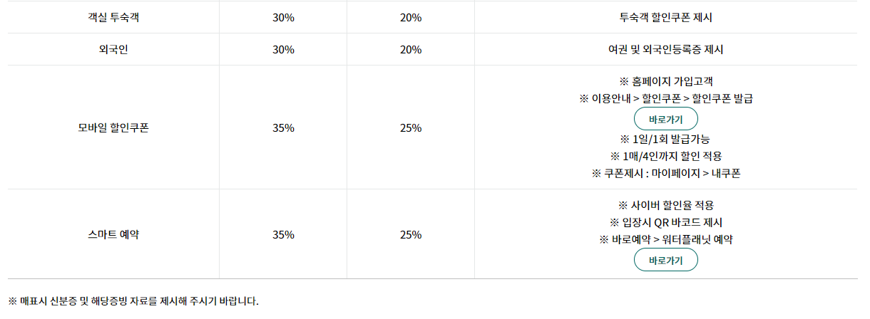 ※ 현장 매표소 결제 시 아래의 할인율이 적용(해당 증빙 제시 필수)
