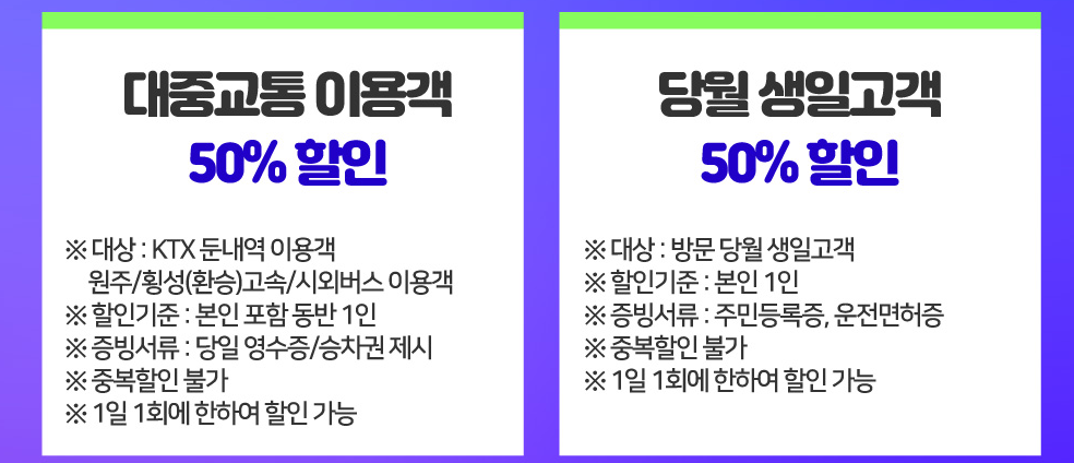 7세 미만 미취학 아동, KTX둔내역 원주/횡성(환승) 고속/시외버스 이용객, 당월 생일고객, 청소년(14~24세), 강원자치도민