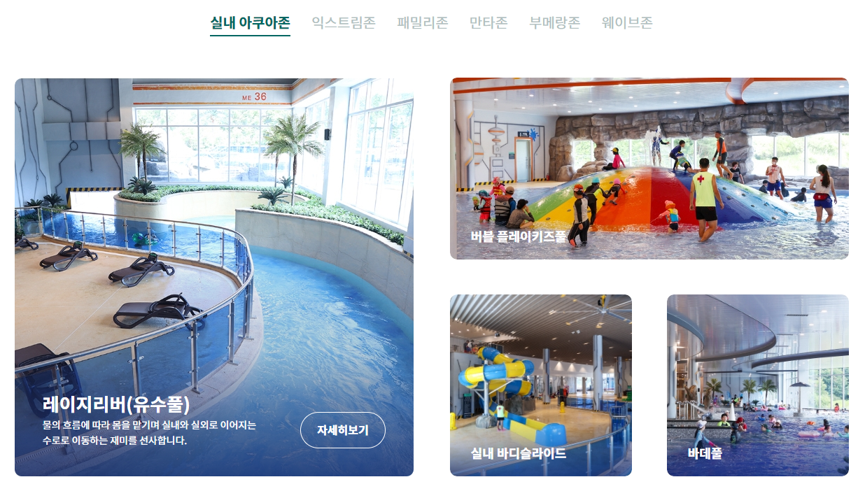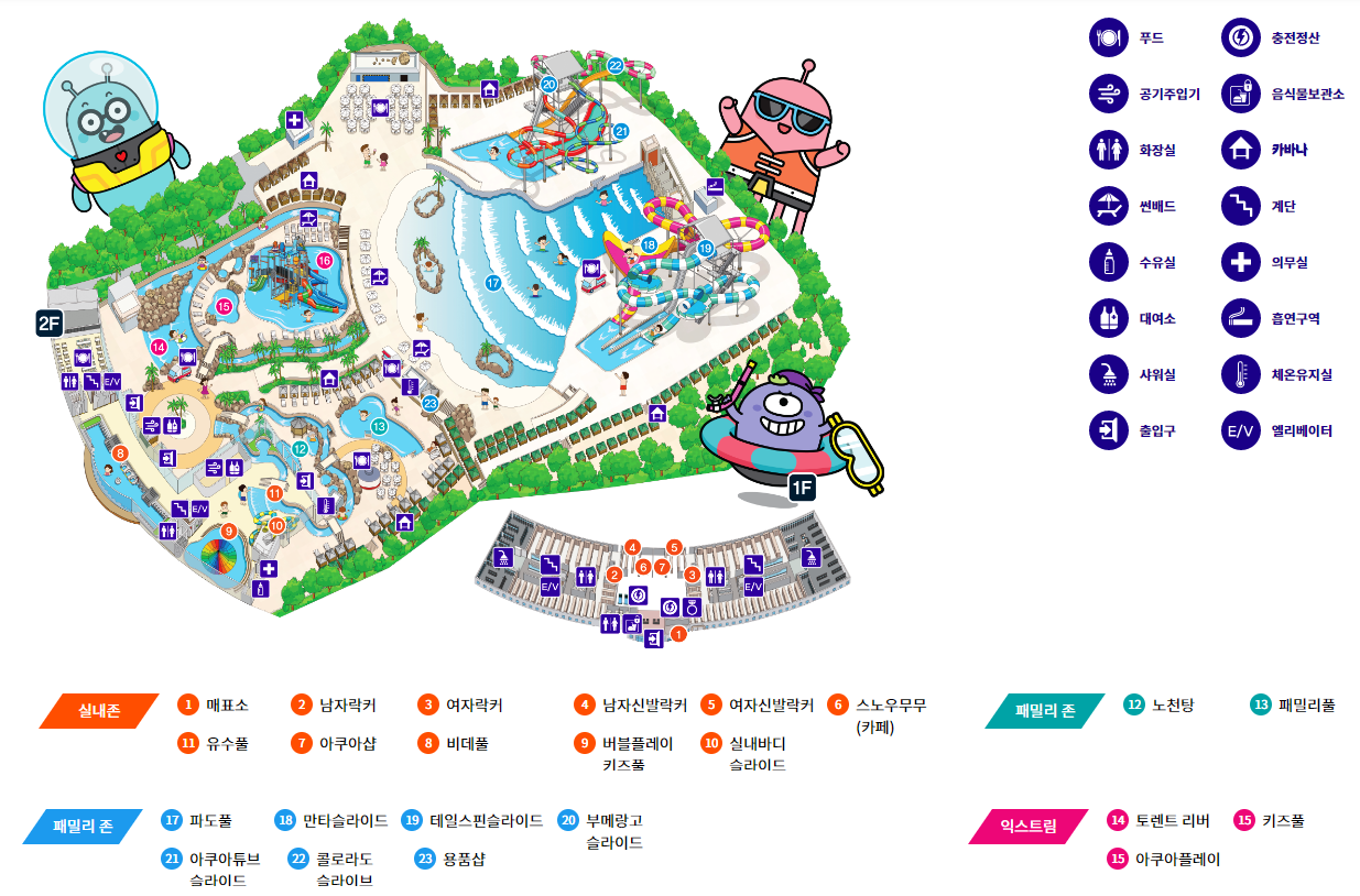 실내존 : 매표소, 남자락커, 여자락커, 남자신발락커, 여자신발락커, 스노우무무(카페), 아쿠아샵, 바데풀, 버블플레이 키즈풀, 실내바디 슬라이드, 유수풀