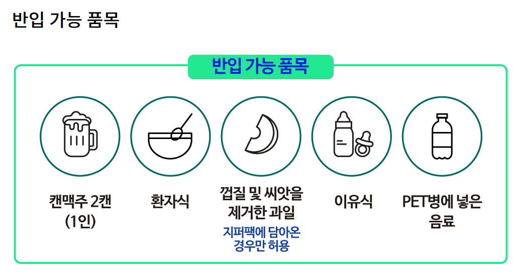 캔맥주 2캔(1인), 환자식, 껍질 및 씨앗을 제거한 과일(지퍼백에 담아 온 경우만 허용), 이유식, PET병에 넣은 음료