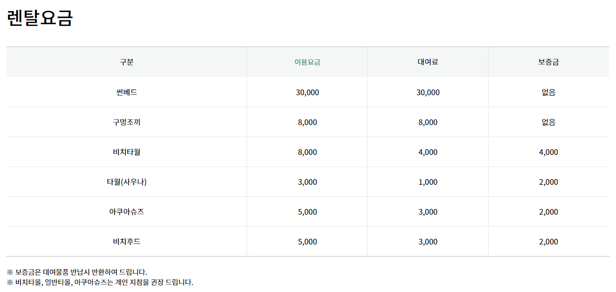 ※ 비치타올, 일반타올, 아쿠아슈즈는 개인 지참을 권장