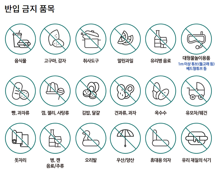 음식물, 고구마, 감자, 취사도구, 말린 과일, 유리병 음료, 대형물놀이용품 1m 이상 튜브(돌고래 등), 베드형 튜브 등, 빵, 과자류, 껌, 젤리, 사탕류, 김밥, 달걀, 견과류, 과자, 옥수수, 유모차/웨건, 돗자리, 병, 캔 음료/주류, 오리발, 우산, 양산, 휴대용 의자, 유리 재질의 식기