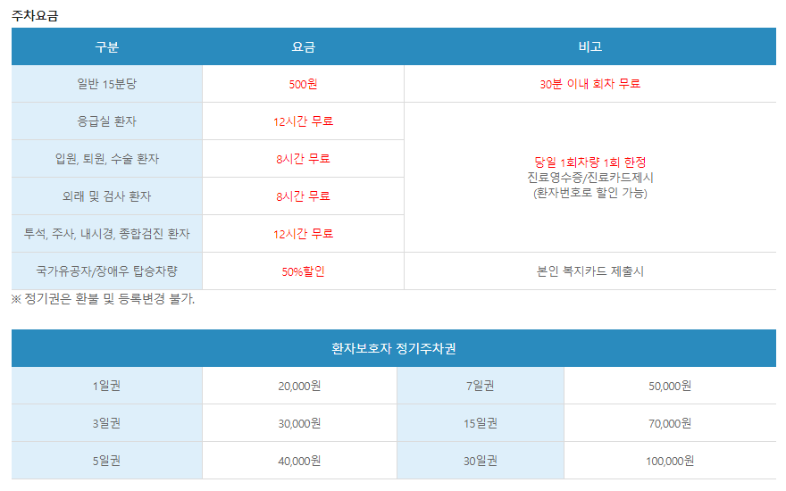 응급실 환자 12시간 무료 (당일 1회 차량 1회 한정, 진료영수증/진료카드 제시, 환자번호로 할인 가능)