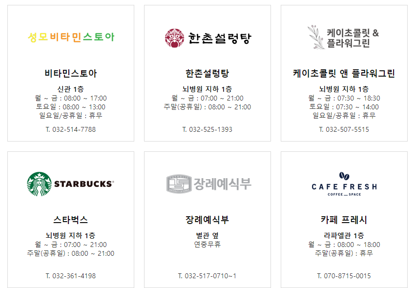 우리은행, 고메브릿지, CU편의점, SM의료기, 프란츠커피, 성모비타민스토아, 한촌설렁탕, 케이초콜릿&플라워그린, 스타벅스, 장례예식부, 카페 프레시