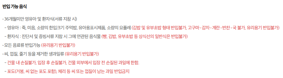 영유아, 환자식, 모든 음료 반입가능(유리용기 반입불가), 씨, 껍질, 줄기 등을 제거한 생과일류(유리용기 반입불가)