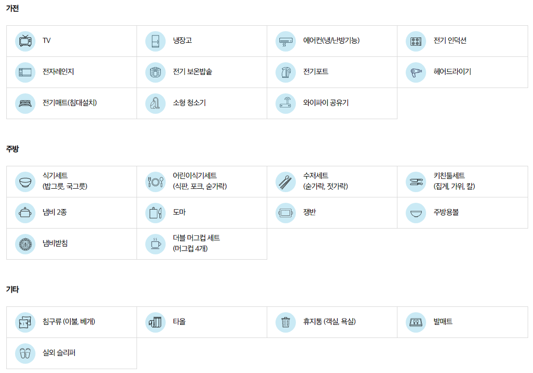 TV, 냉장고, 에어컨(냉/난방가능), 전기인덕션, 전자레인지, 전기 보온밥솥, 전기포트, 헤어드라이기, 전기매트(침대설치), 소형청소기, 와이파이 공유기