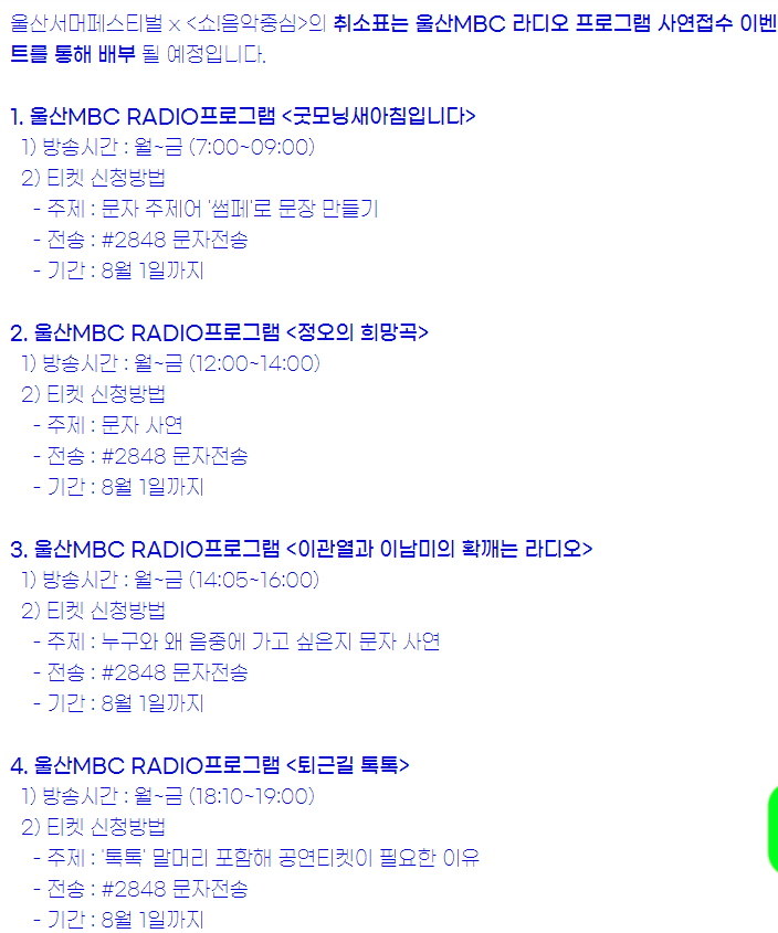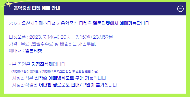 쇼음악중심을 제외한 나머지 울산서머페스티벌 공연은 티켓 없는 선착순 무료관람입니다.