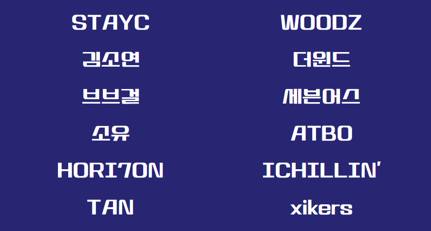 STAYC, WOODZ, 김소연, 더윈드, 보브걸, 세븐어스, 소유, ATBO, HORI7ON, ICHILLIN', TAN, xikers