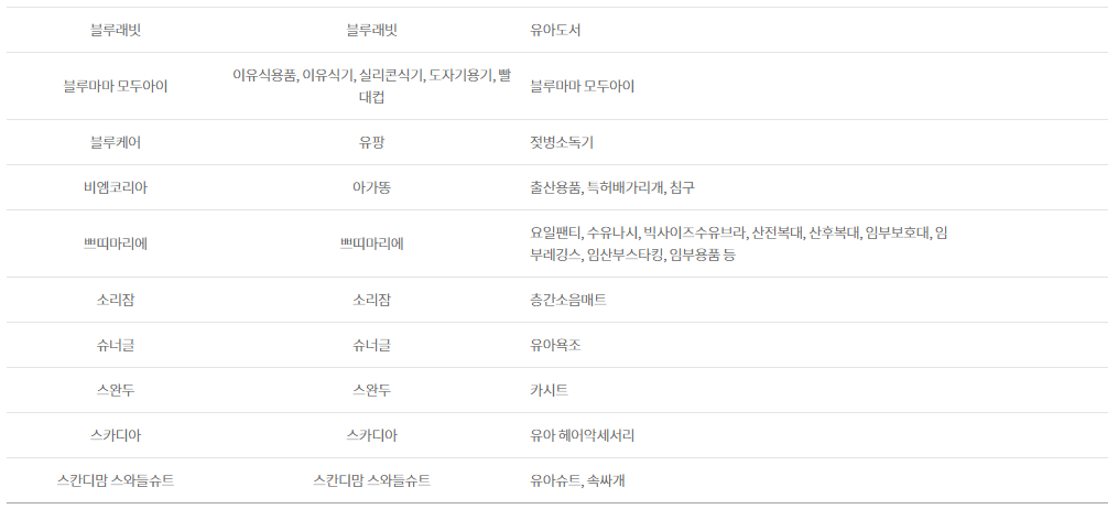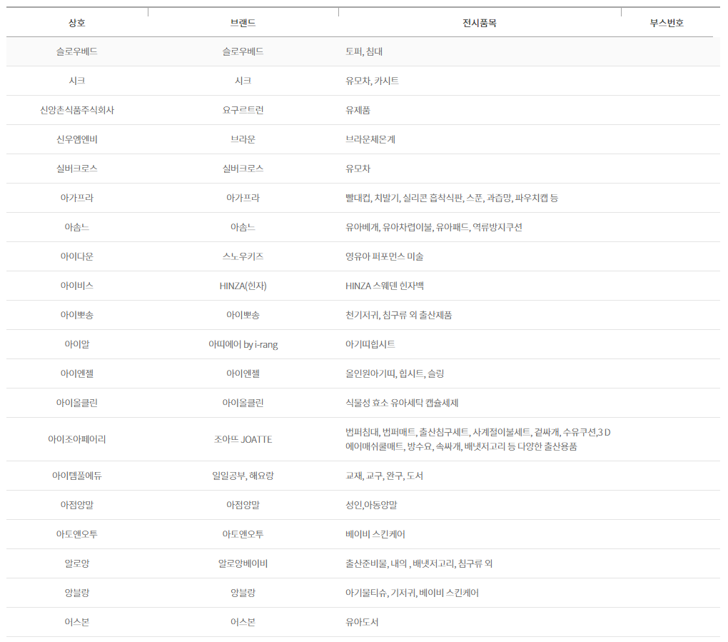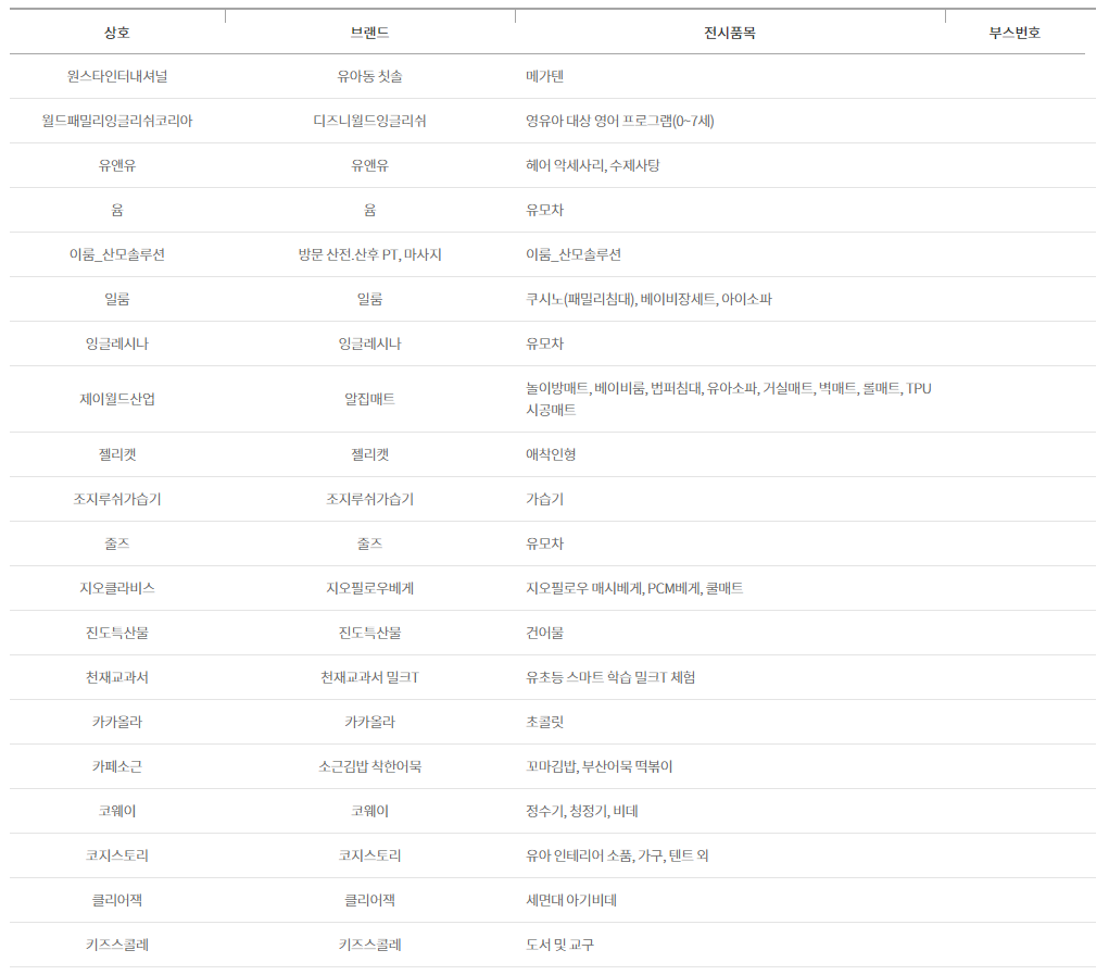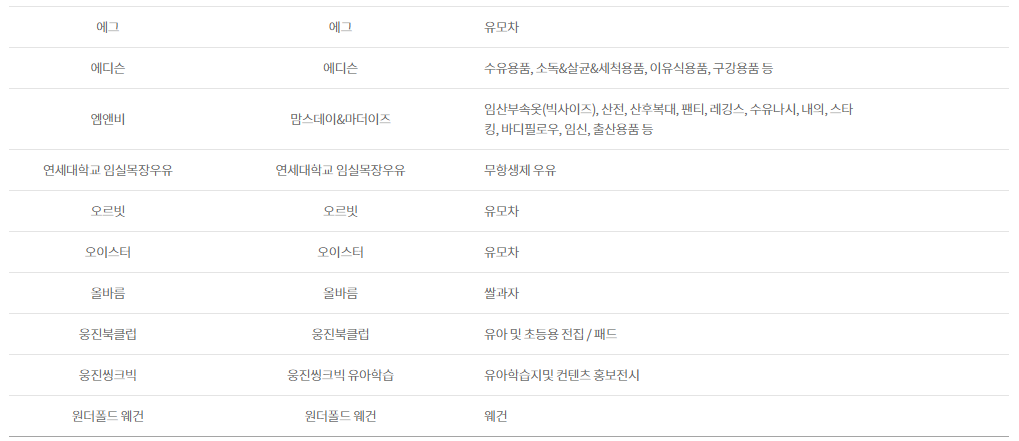 DB손해보험, SK매직, 곰푸드, 구쁘, 귤하르방, 그로미미, 꼬까신, 꼬마루육포, 나투라비타, 이치비야, 다인맘스케어, 닥터맘 산후도우미(정비지원서비스 제공기관), 풀무원 대화지점, 동양생명보험, 두나, 나이키, 조던, 칼하트, NBA, MLB, 럽맘, 레카로, 로토토베베, 루솔, 르베베, 르클레르, 아이락(조끼형 카시트), 마루앤, 마마루, 맘스네이처, 망고제이, 맥시코시, 메르베 프리미엄, 모모앤베베, 모윰, 무루, 미마, 바비큐스쿨, 소독하는 아이, 밤부베베, 방문미술 그림샘, 범프라이더, 베르블랑, 베베랑, 베베루나, 베베스미스, 더마더, 베스루비, 베이비조거, 베이비파스텔, 보틀매트, 보벨디자인, 브라이텍스, 블랑101, 블루래빗, 블루마마 모두아이, 유팡, 아가똥, 쁘띠마리에, 소리잠, 슈너글, 스완두, 스카디아, 스칸디맘 스와들슈트, 슬로우베드, 시크, 요구르트런, 브라운, 실버크로스, 아가프라, 아솜느, 스노우키즈, HINZA(힌자), 아이뽀송, 아띠에어 by i-rang, 아이엔젤, 아이올클린, 조아뜨 JOATTE, 일일공부, 해요량, 아점양말, 아토앤오투, 알로앙베이비, 앙블랑, 어스본, 에그, 에디슨, 맘스데이&마더이즈, 연세대학교 임실목장우유, 오르빗, 오이스터, 올바름, 웅진북클럽, 웅진씽크빅 유아학습, 원더폴드 웨건, 유아동 칫솔, 디즈니월드잉글리쉬, 유앤유, 윰, 이룸 산모솔류션, 일룸, 잉글레시나, 알집매트, 젤리캣, 조지루쉬가습기, 줄즈, 지오필로우베개, 진도특산물, 천재교과서 밀크T, 카카올라, 소근김밥 착한어묵, 코웨이, 코지스토리, 클리어잭, 키즈스콜레, 파란가게, 킨즈웨건, 타이니러브, 튼튼영어 베이비리그, 튼튼영어 주니어플러스, 닥터맘스, 페르바도, 포그내, 앙뽀, 폴레드카시트, 프레벨라, 프뢰벨 행복나누기, 픽셀 소독기, 하루상점, 하이브리드, 한국토지주택공사, 한솔핀덴, 한스네이처 오가닉, 해든스튜디오, 허그파파, 베이비락 아기유산균, 허브랑목화랑, 현대프리미엄아울렛 김포점, 현대해상보험, 현미한톨, 홀라, 화음베베