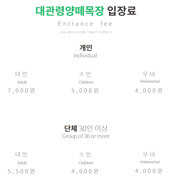 무료 : 36개월 미만 영유아, 국가유공자 본인, 대관령면민소인 기준 : 36개월(만 3세) 이상 초등학생/중학생/고등학생단체 기준 : 30인 이상(학교, 직장, 동호회 등 방문 전 설립된 단체)우대 기준 : 만 65세 이상, 장애등급 1~3급(본인 및 보호자 1인), 평창군민, 의무복무 중인 군인(장교 및 부사관 제외)무료 및 우대요금 적용을 받기 위해서는 관련 증명서를 필히 제출하셔야 합니다.예약 없이 정해진 입장 시간 내 입장하시면 체험 및 관람이 가능합니다.공식적인 휴무는 설날(음력 1.1)과 추석(음력 8.15) 당일입니다. 일 년 중 이틀을 제외하고는 관람이 가능하지만 폭설, 폭우, 강풍, 태풍, 뇌우 등으로 인해 관람이 불가능하다고 판단될 경우에 사전 예고 없이 입장을 제한할 수 있어요.