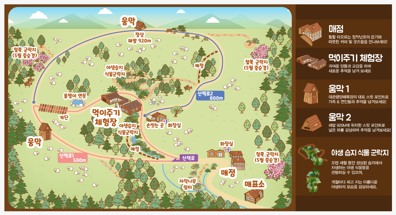 ◈ 목장 안으로는 차량이 출입 금지되어 있어서 자동차는 주차장(구)대관령 휴게소에 주차하시고 도보로 이동해 주시면 됩니다.